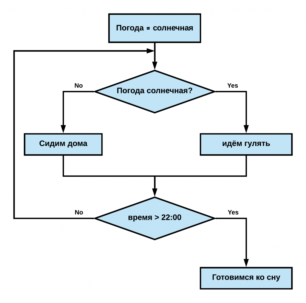 В науке об алгоритмах выделяют три базовые алгоритмические конструкции, с помощью которых можно записать любую последовательность действий: следование, ветвление и цикл. Следование представляет из себя последовательность инструкций, выполняемых поочередно, одна за другой. Такой тип конструкции уже пройден. Ветвление представляет из себя несколько различных сценариев (последовательности команд), которые запускаются, если соблюдено некоторое условие. Цикл - это повторение некоторой последовательности действий либо заданное количество раз, либо пока соблюдается некоторое условие. Примеры схем этих конструкций представлена на Figure 7.1, Figure 7.2, Figure 7.3.