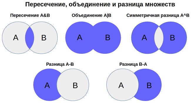 Figure 8.1: Визуализация операций над множествами с помощью кругов Эйлера