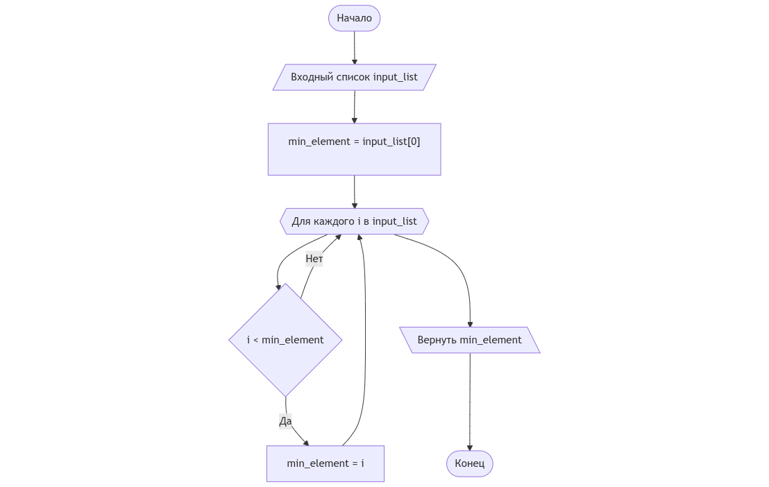 Решение: предположим, что минимальным элементом в списке является нулевой элемент. Тогда мы сравним каждый элемент списка с предполаемым минимальным значением. Если мы обнаружим значение меньше предполагаемого, то тогда заменим его на найденное. После всех сравнений вернем итоговое значение. В графическом представлении алгоритм, можно представить следующим образом: