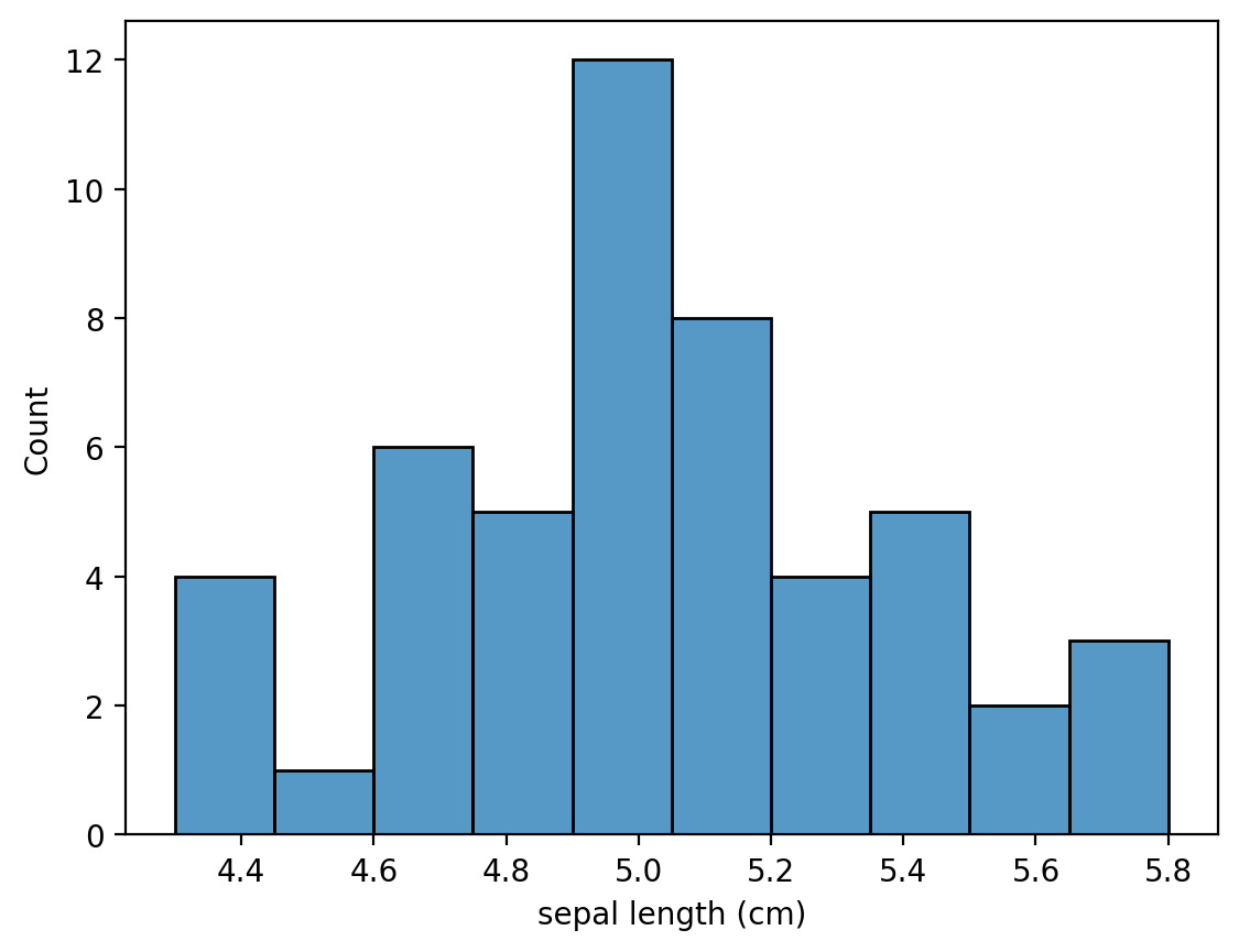 setosa_sepal_length = iris_df.loc[iris_df["species"] == "setosa", "sepal length (cm)"]