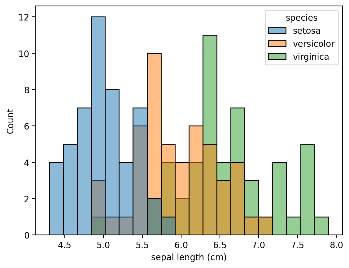 sns.histplot(data = setosa, x = "sepal length (cm)", bins = 10)Случай изображения всех классов на одном графике ещё проще. Кроме того, seaborn позаботиться о легенде.