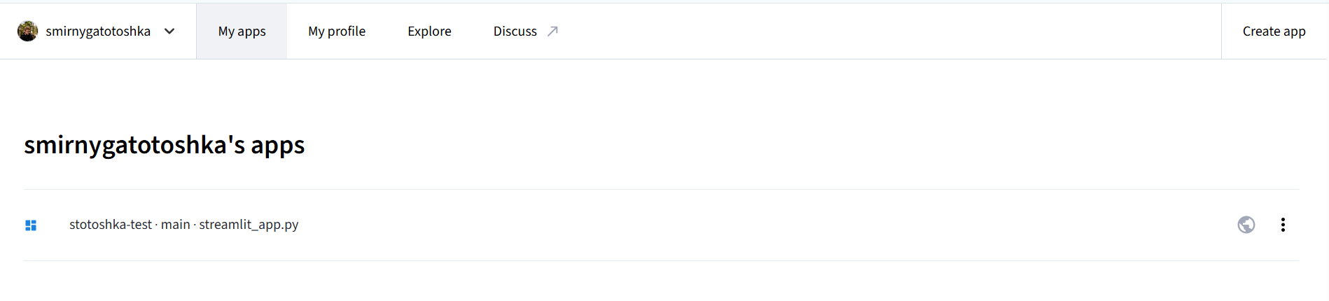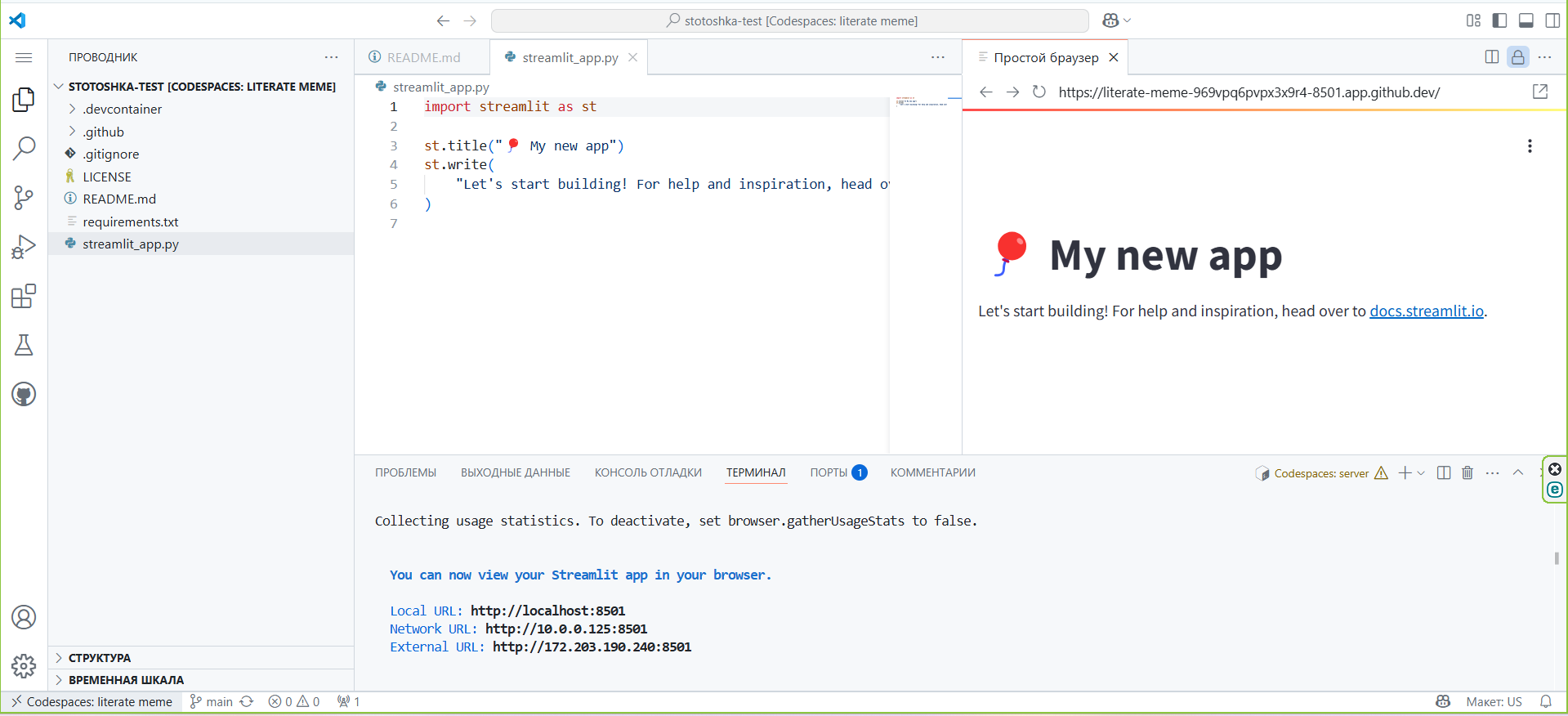 Для того, чтобы работать над нашим приложением в облаке и сразу делать его общедоступным (деплоить (deploy) на сервер Streamlit) перейдите по ссылке. Создайте новое приложение и свяжите его с вашим профилем GitHub. В случае успеха у вас должно открыться окно профиля с новым приложением (@fig-streamlit_profile) и онлайн VSCode в облачном окружении GitHub(@fig-github_vscode)
